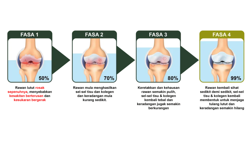 Akibatnya, tubuh kita GAGAL untuk menghasilkan sel dan struktur Tulang Rawan Sendi serta Cecair Pelincir Sendi yang menyebabkan sendi semakin haus dan cecair pelincir semakin berkurang